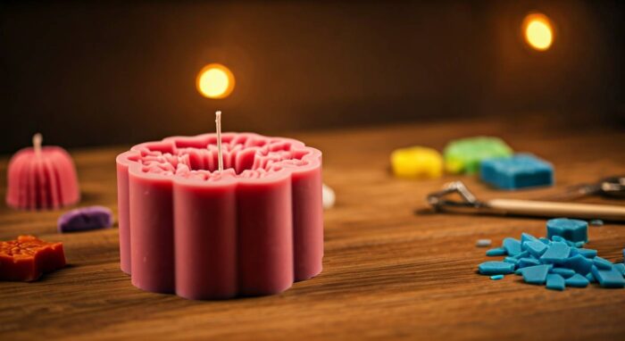 Forma do świecy również ma znaczenie — może to być silikonowa foremka albo eleganckie szklane naczynie. Silikonowe formy są elastyczne, co ułatwia wyjęcie gotowego produktu.